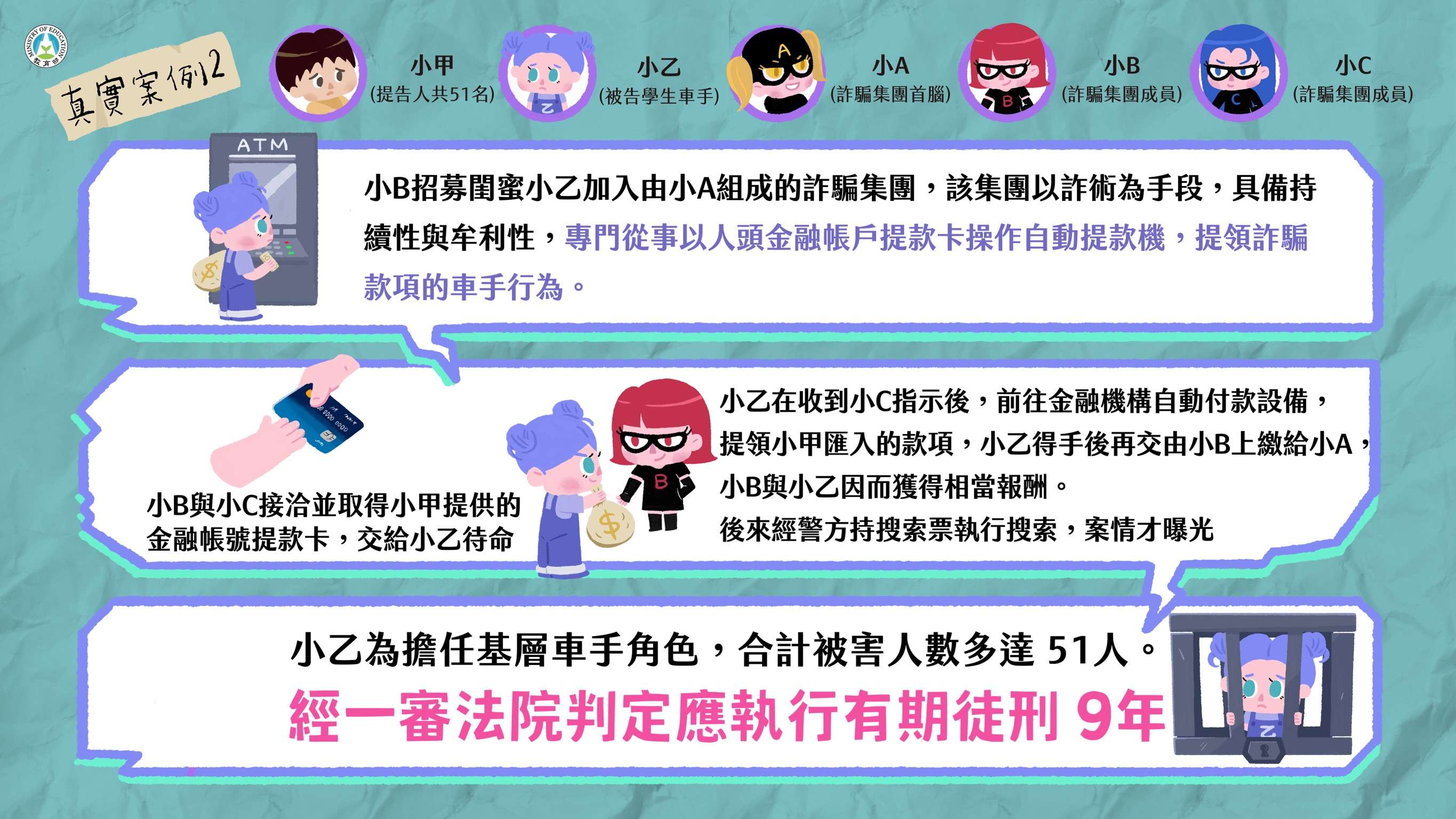 擔任詐騙車手所可能承擔的法律責任,製作本案懶人包,避免學生遭不法分子利用,衍生後續的法