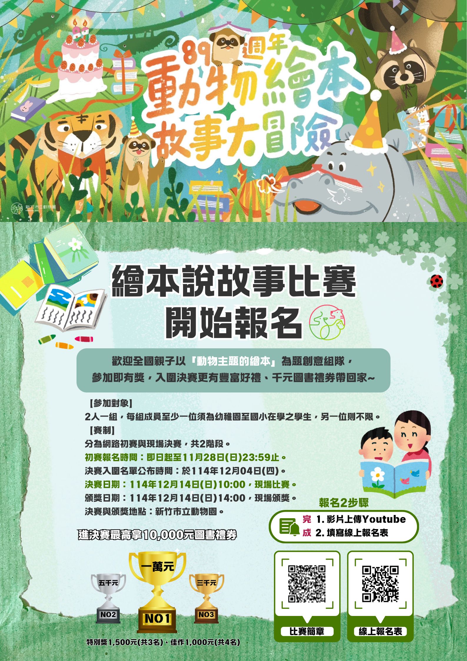 | 一、 | 本園適逢89週年,為了推廣動物與環境保育,即日起辦理【89週年動物繪本故事大冒險】說故事比賽,目前已開放報名。歡迎幼兒園及國小親子以「動物主題的繪本」為題創意組隊。 |