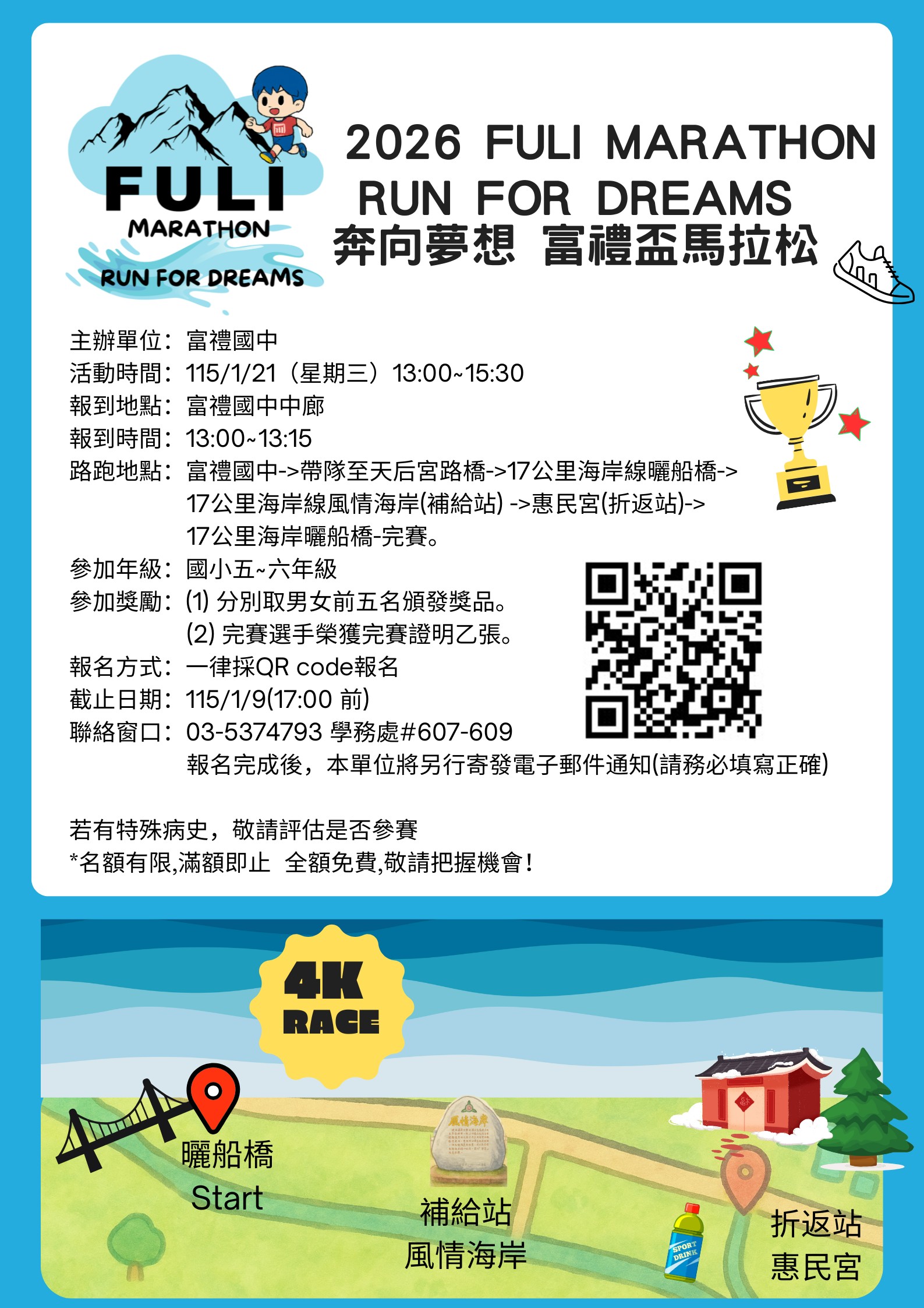 富禮國中為推動路跑運動向下扎根,並提升學生之專注力與體能及運動素養,邀請國小學生參加馬拉松路跑活動。