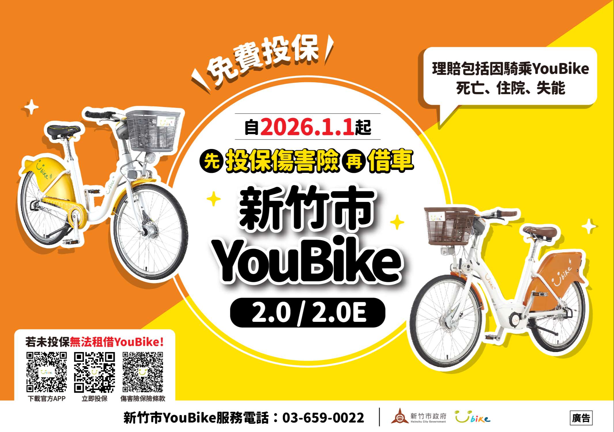 一、考量民眾往來交通節點、學校、各級機關、觀光景點、旅遊中心及活動中心等場所頻繁、新竹科學園區、大專院校及各級學校,亦有學術商務交流,請各單位協助利用各式管道,宣導租借YouBike2.0全車種前需完成投保傷害險、投保免費及如何加保等資訊,自115年1月1日起,未投保傷害險無法借車。