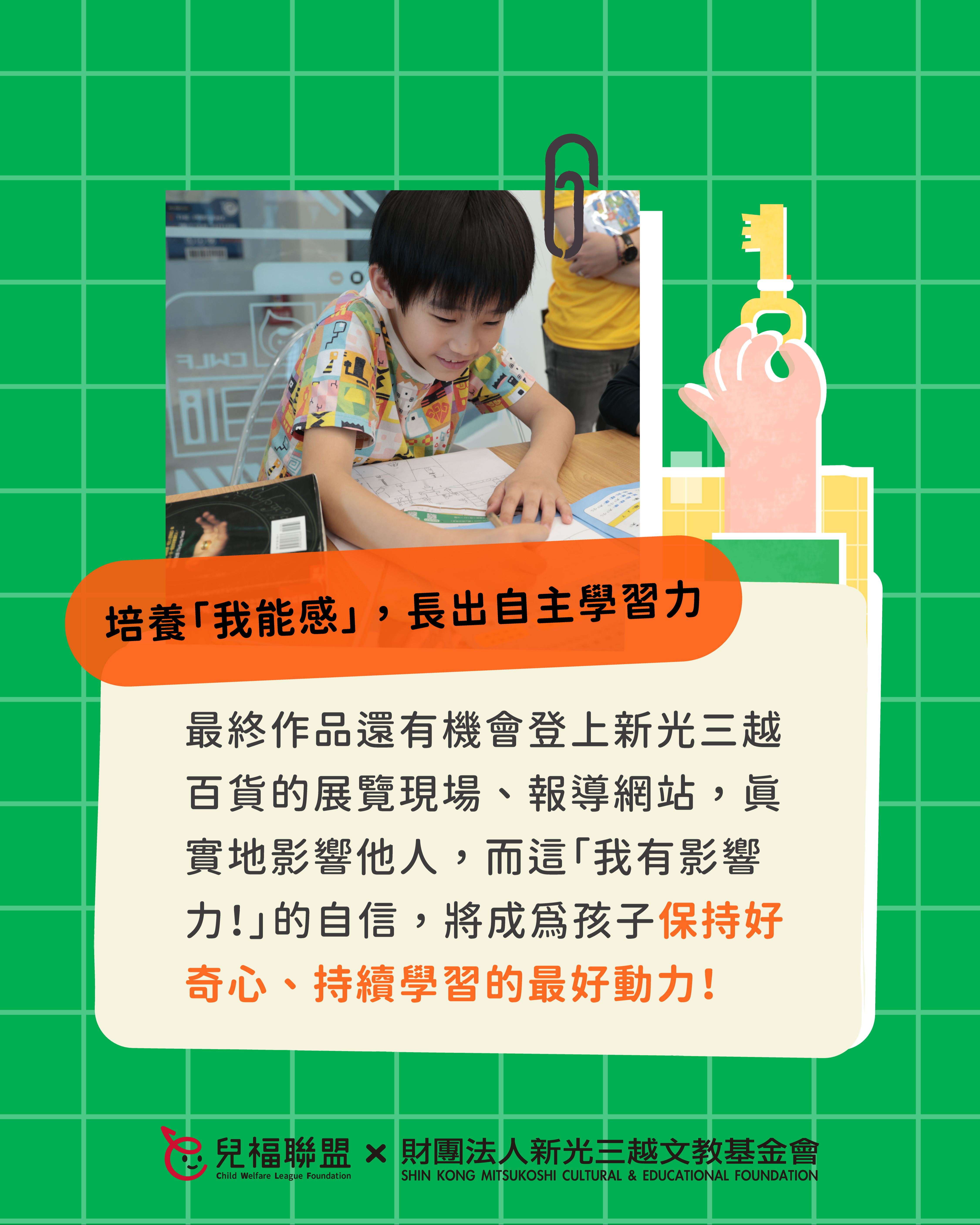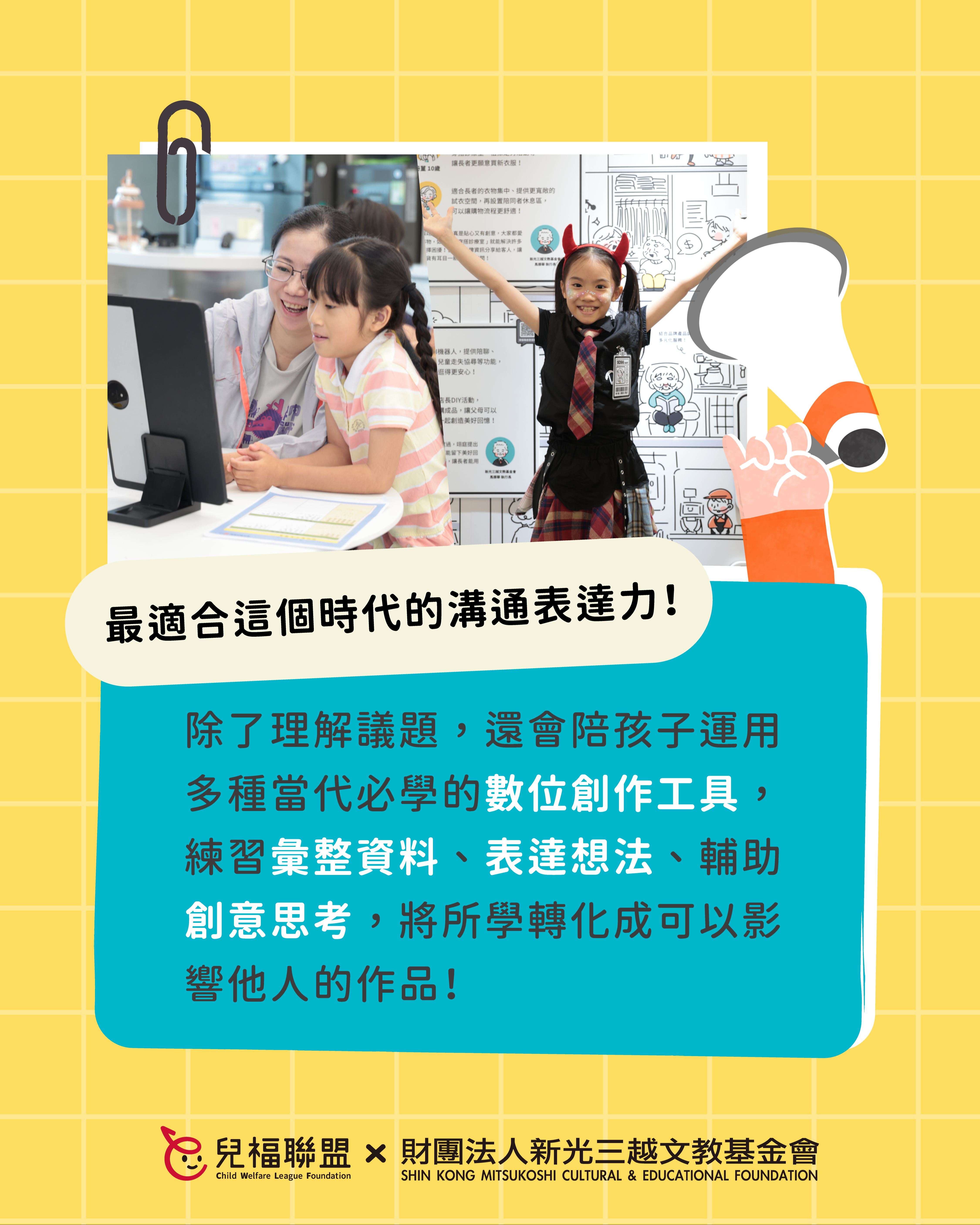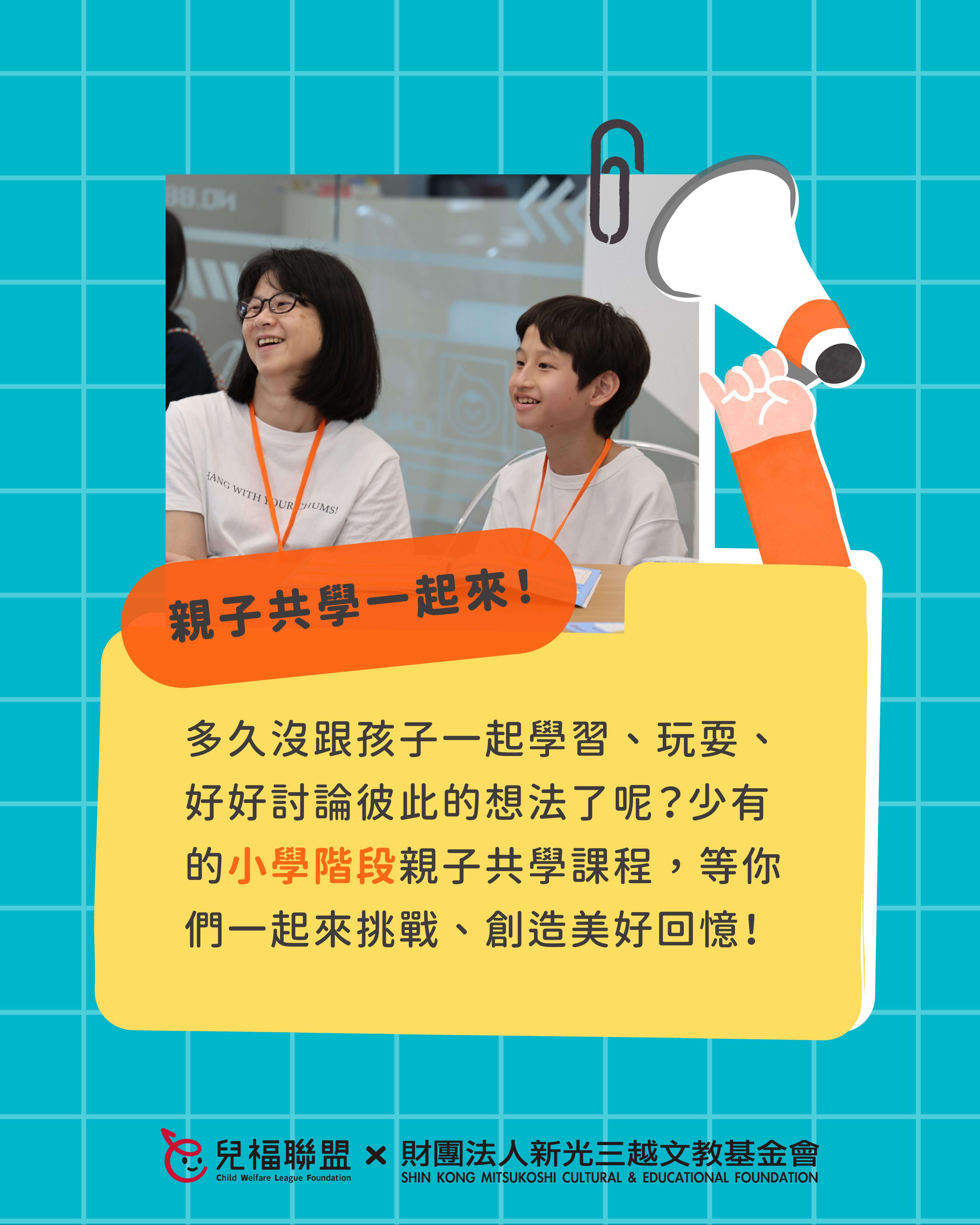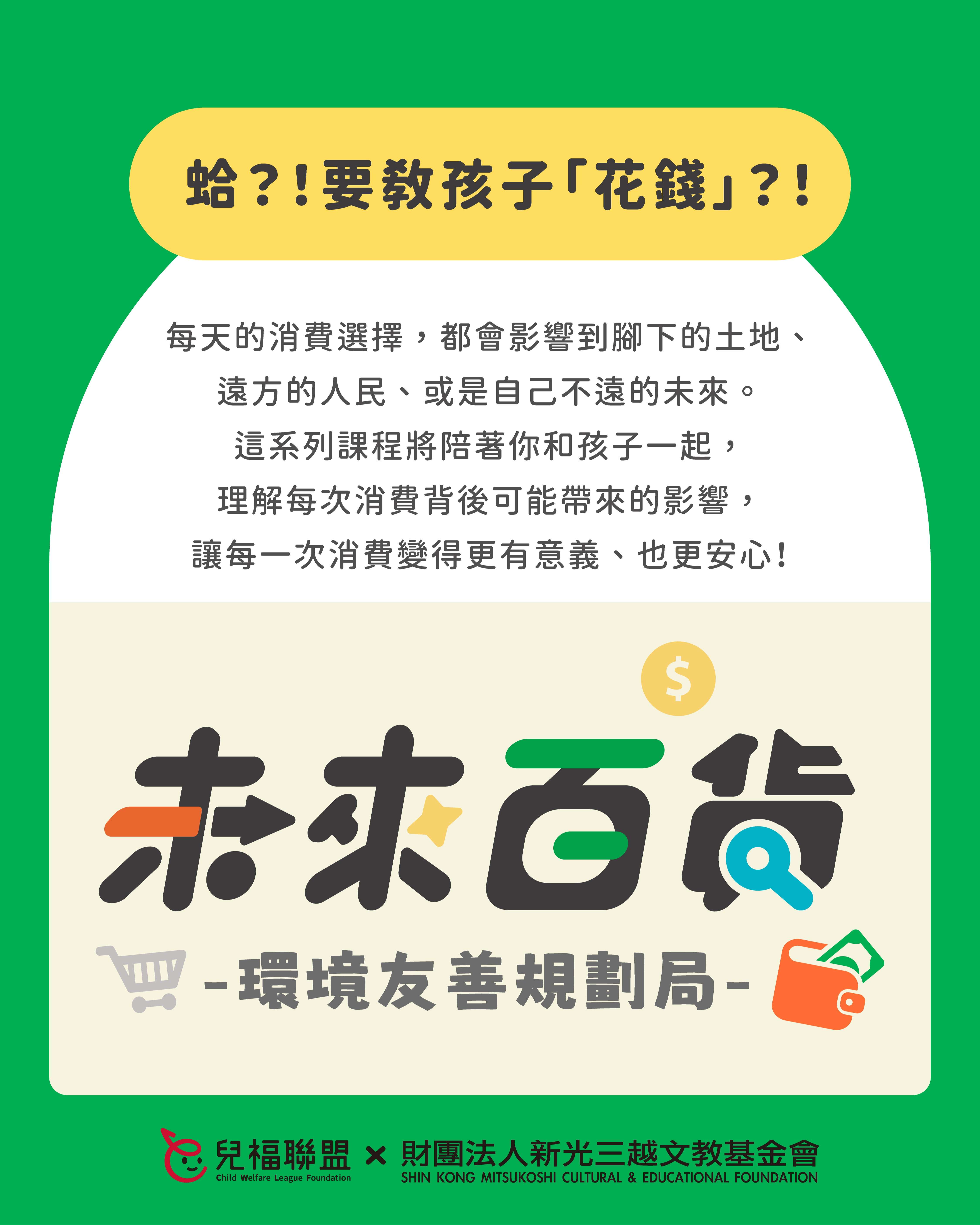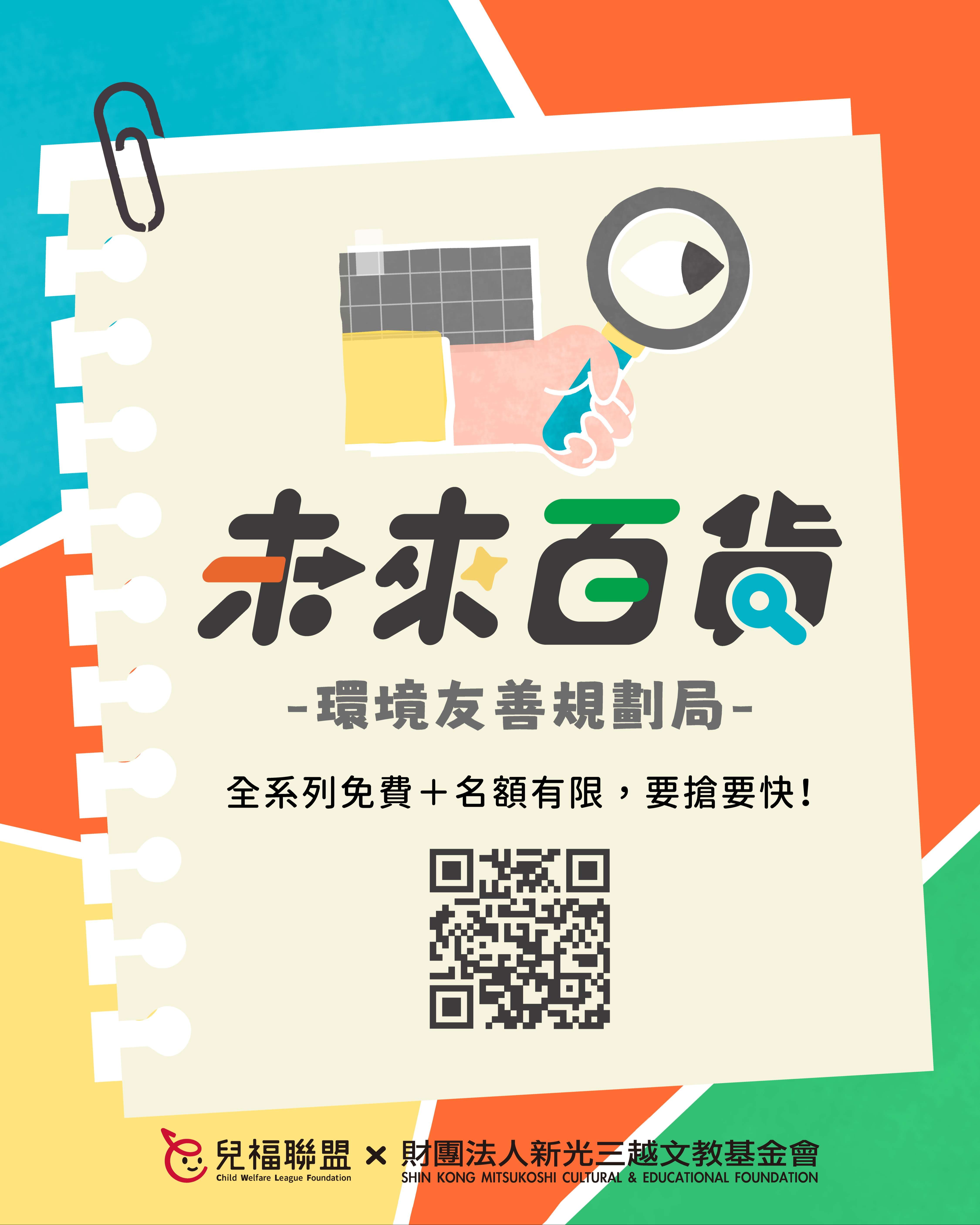 說明: 一、 為培養學童面對未來社會的獨立思考、溝通表達、永續素養等能力,並促進親子共學機會,本會辦理「新人類時光機:未來百貨-環境友善規劃局」系列課程,透過貼近生活、以遊戲和體驗為主的學習設計,引導孩子理解責任消費、環境保護等永續議題,練習整理觀點並付諸行動,以家庭、自身的生活為起點,為社會帶來良善的改變! 二、 本系列課程重點特色如下: (一) 親子共學參與:以親子為單位共同參與,家長與孩子一同討論、發想與完成學習任務,共創美好回憶。 (二) 生活化永續學習:從日常消費選擇出發,引導孩子觀察生活與社會、環境之間的關聯。 (三) 數位工具輔助學習:課程中將運用數款數位工具,協助孩子進行資料整理、觀點梳理與創作表達,培養邏輯思考與資訊統整能力。 (四) 行動與表達能力培養:陪伴孩子整理所學,完成可與他人分享的學習成果,練習將觀察與想法轉化為清楚的表達、實際的行動。 (五) 完整學習歷程:完整學習歷程:課程循序引導孩子經歷「理解議題→深入探索→付諸行動影響他人」的培力過程,強化自信與行動力,培養孩子的自主學習技巧及意願。 三、 活動資訊摘述如下: (一) 對象:國小三至六年級學生及其同住家長(一位家長搭配一位孩子)共同報名。 (二) 時間:課程將於115年3月間之週六辦理,並預計將於7月在新光三越百貨舉辦展覽及結業儀式,詳情請參閱報名頁面。 (三) 地點:兒福聯盟 南西服務中心(近台北捷運中山站六號出口)。 (四) 費用:本課程採保證金方式參與,全程參與課程、並於時限內完成學習任務者,保證金將依規定全額退還,詳情歡迎參考報名網頁之說明。 (五) 報名方式:即日起開放線上報名,名額有限,額滿為止,報名詳情請至: https://lihi.cc/Gf3KM 四、 敬請貴校惠予協助公告並轉知家長,鼓勵親子一同參與,陪伴孩子透過生活學習,培養關懷社會與行動實踐的能力。如有任何疑問,歡迎聯絡本活動報名窗口陳小姐(02-2558-6625 #13)