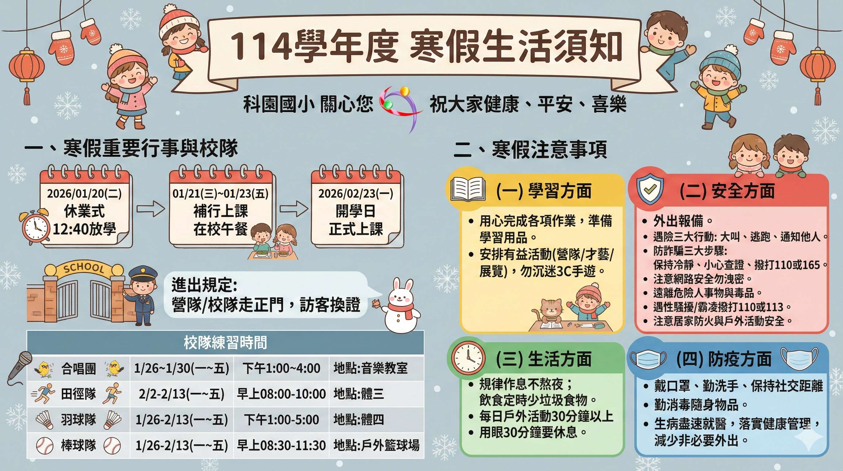 (一) 2026/01/20(二)為學期休業式,全校放學時間:12:40。