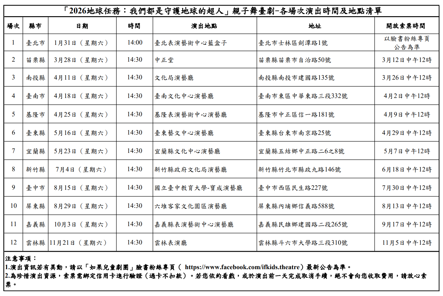 一、 依據環境部115年1月16日環部保字第1151002610號函辦理 二、 旨揭親子舞臺劇係將環境教育主題故事繪本以兒童舞臺劇方式進行宣導,內容改編自113年環境教育繪本比賽中獲獎的4本作品,包含臺中市的《2050北風太陽大作戰》、新竹市的《佈布島》、新竹縣的《暖暖》及南投縣的《怎麼辦蜜蜂消失了》,並取名為「2026地球任務:我們都是守護地球的超人」。 三、 本劇中融入豐富的環保知識,適合親子一起欣賞,故事主題宣導氣候變遷與循環經濟,劇情情節扣合節能減碳、減塑生活與資源循環等環保議題。 四、 本舞臺劇皆為免費入場,每場演出時間為70分鐘,開演前40分鐘,憑登記成功紀錄(E-mail通知信),現場換票入場,1人1券,自由入座;惟每場次於演出前2週,在網路開放登記索票,每人限登記4 張(索票網址為https://reurl.cc/MMgKLX)。每場次演出結束後,辦理抽獎活動,憑入場票券參加抽獎,獎項包括空氣清淨機、滑板車及繪本故事書等。 五、 後續各場次時間或地點如有異動,以「如果兒童劇團」臉書粉絲團(https://www.facebook.com/ifkids.theatre)最新公告為準。 六、 檢送環境部「『2026地球任務:我們都是守護地球的超人』親子舞臺劇-各場次演出時間及地點清單」1份。