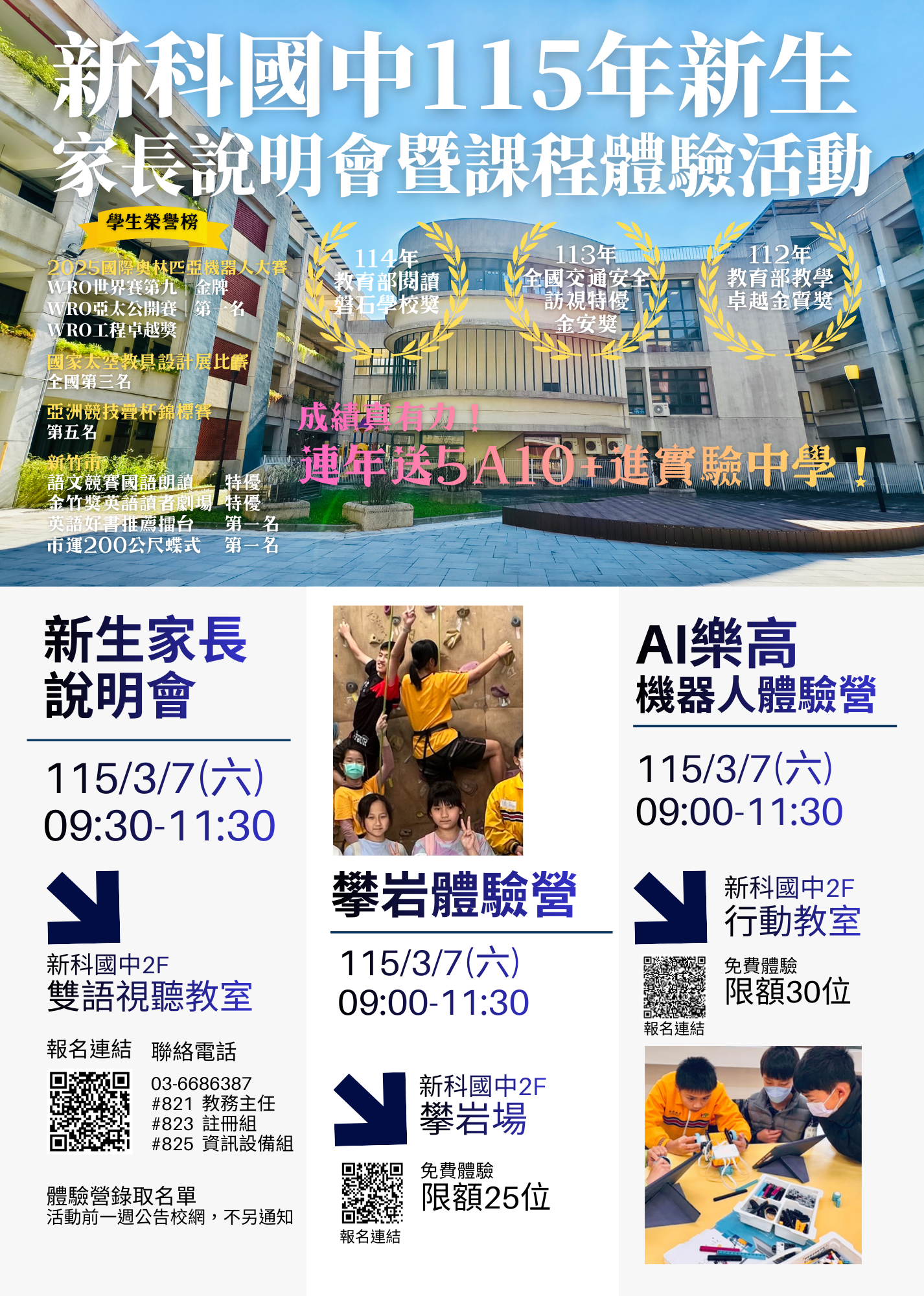 說明: 本校規劃新生家長說明會、機器人課程、攀岩體驗活動如下,敬請協助公告周知貴校親師生,至紉公誼: 一、 活動日期:115年3月7日(六) 二、 活動場次: (一) 新生說明會:09:00-11:30。 (二) 新生體驗營活動:09:30-11:30(學生可擇一報名) 1、 AI機器人體驗活動 2、 攀岩體驗營 三、 報名方式:由以下連結報名、掃描活動海報上QRCode報名或至本校官網「最新消息」進行線上報名 (一) 新生說明會(網址:https://pse.is/8r9dz6) (二) AI機器人 (網址:https://reurl.cc/laNG3A) (三) 攀岩體驗 (網址:https://pse.is/8r9e6p) 四、 報名截止日:115年3月3日。 五、 相關報名資訊及活動錄取公告,敬請查閱本校網站,網址為:https://www.hkjh.hc.edu.tw/